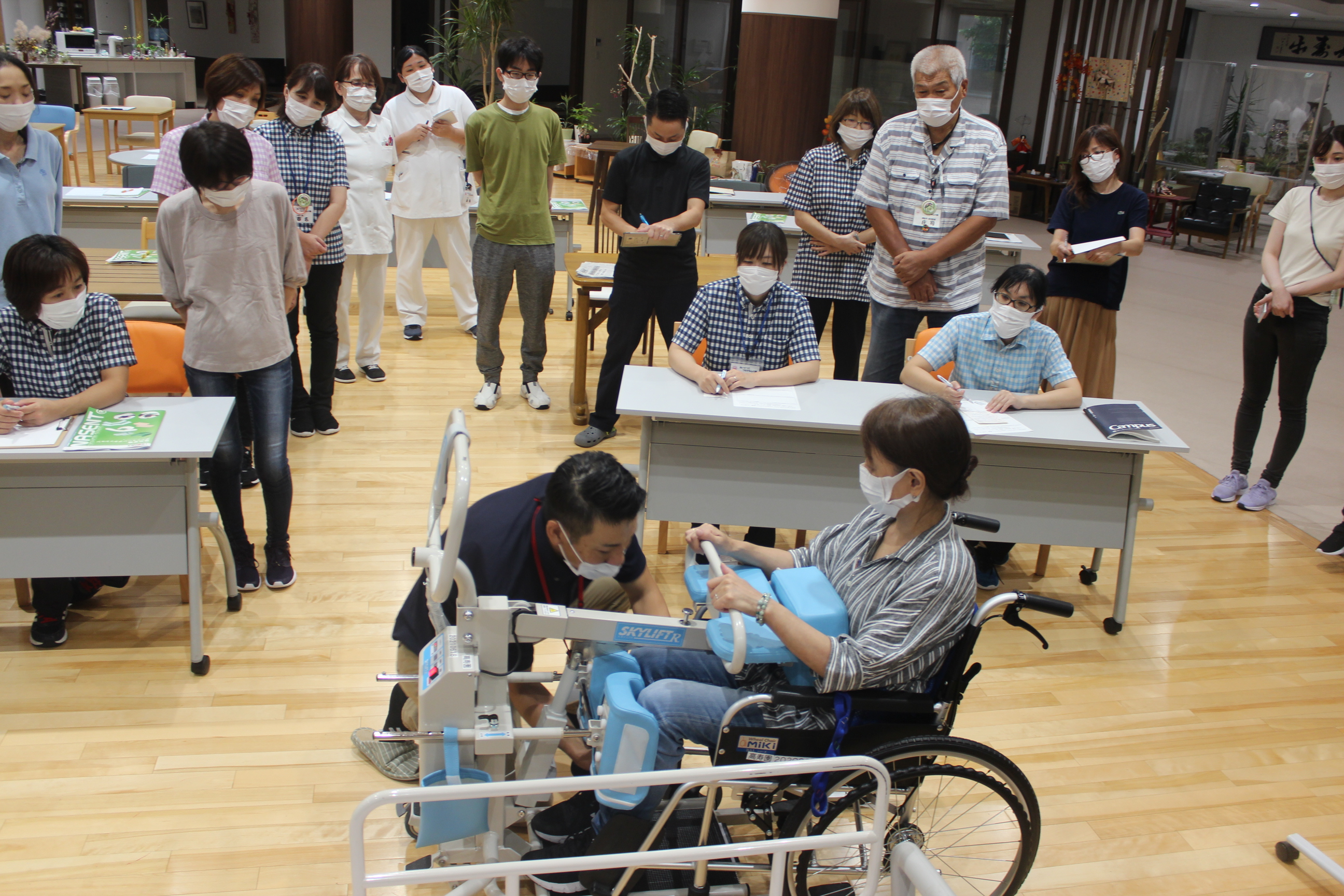 アイソネックの方に来ていただきスタンディングリフトの研修を行いました。 施設長にモデルになってもらっています!