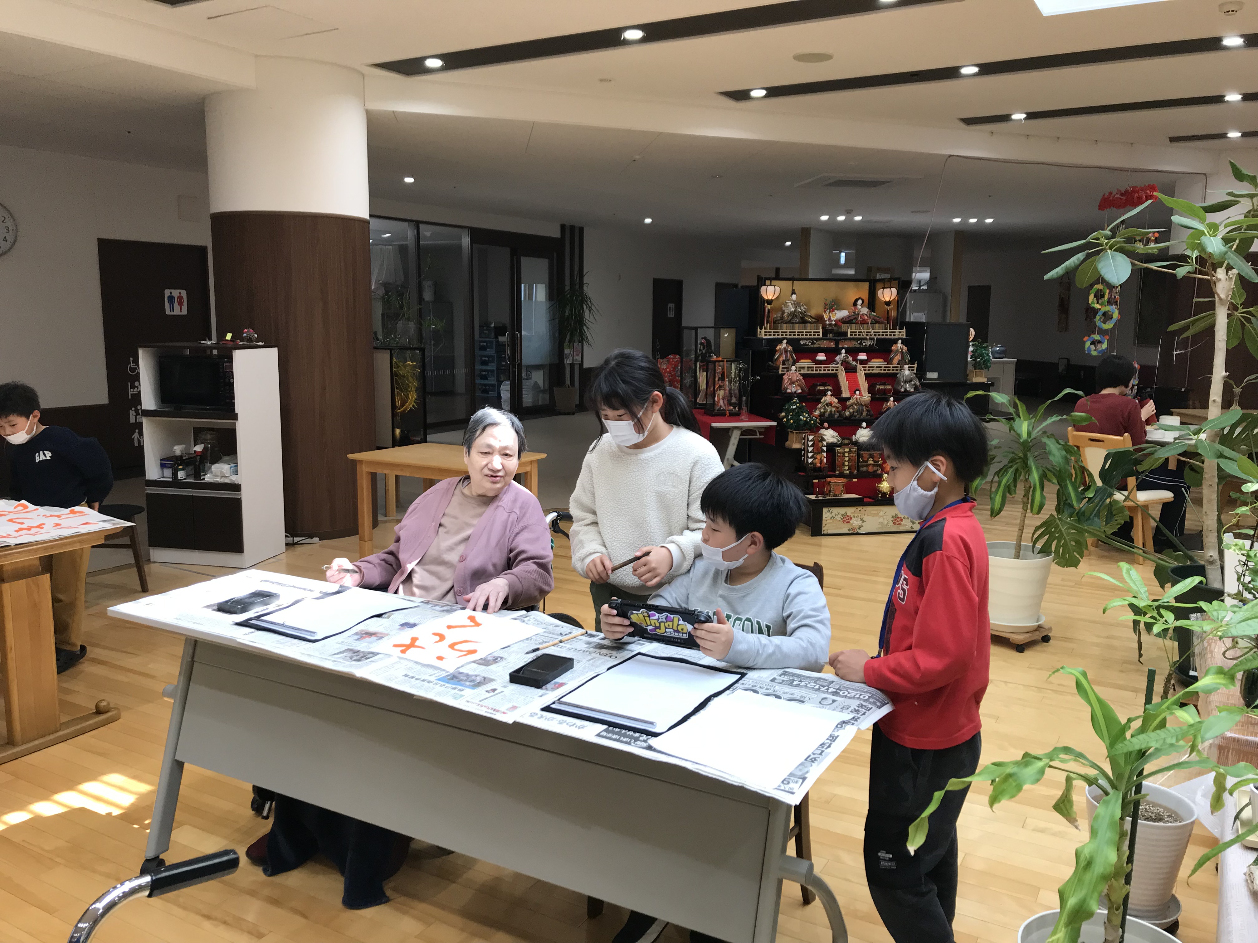 子供スタッフも「習字なんかしたことないー!!」と言いながらも入居者の方と一緒に並んで頑張ってました♪
