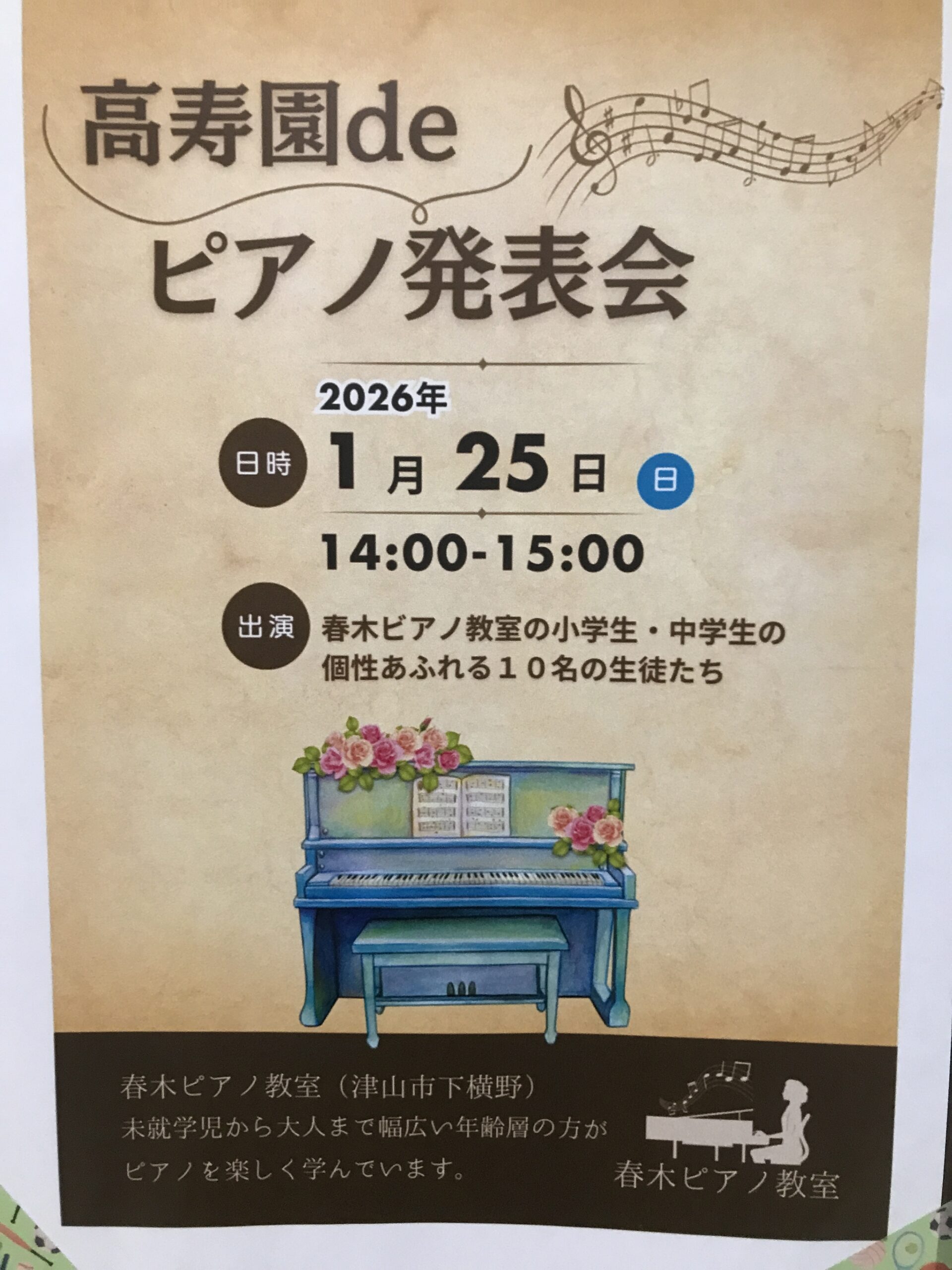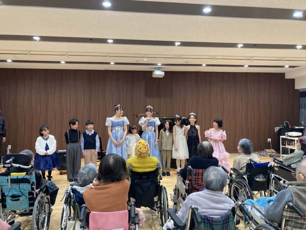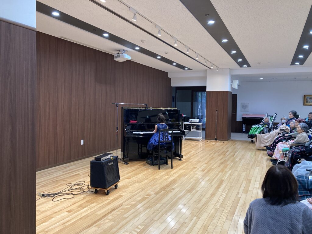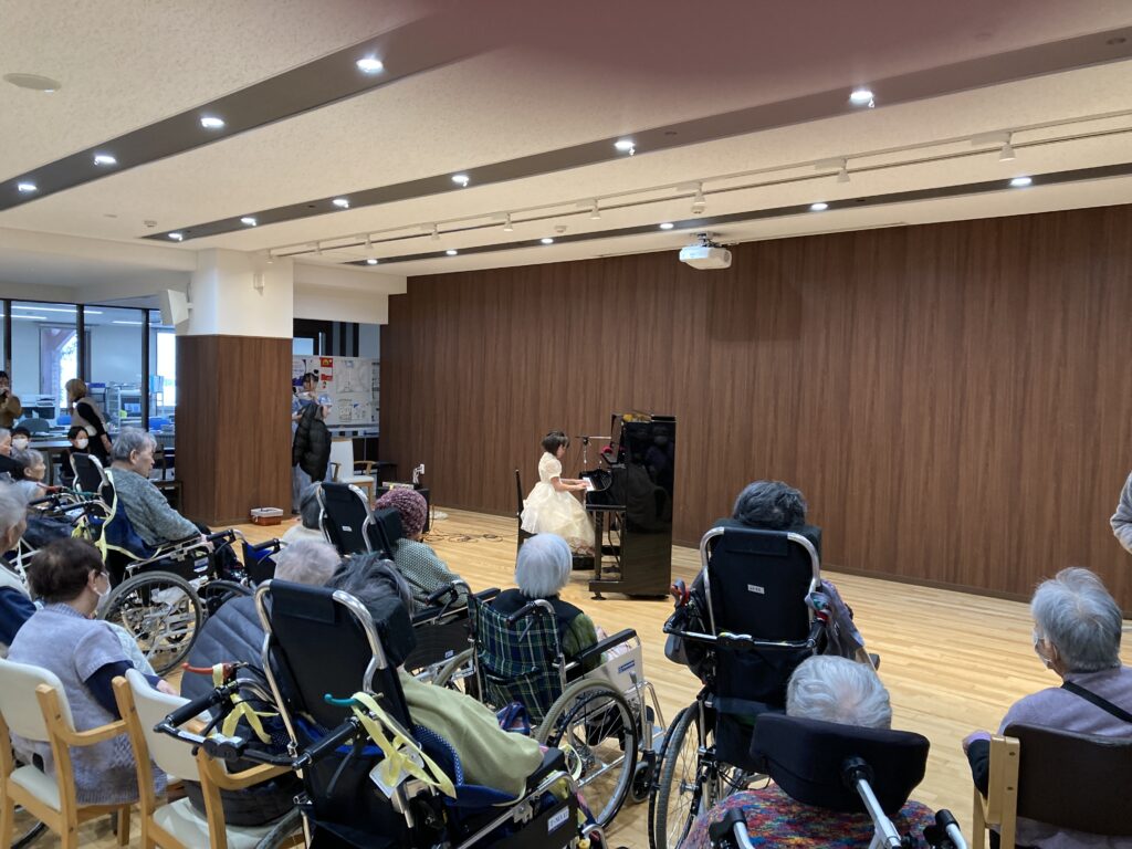 高寿園にて、春木ピアノ教室の皆さんによる発表会が開かれました。当日は、小学1年生から中学3年生までの10名が参加し、日頃の練習の成果を心を込めて披露してくれました。真剣に演奏する姿に、入居者の皆さんも静かに耳を傾けておられました。演奏後には「かわいいね」「上手だったね」といった温かい声も聞かれ、会場は和やかな雰囲気に包まれました。またぜひ、高寿園に練習の成果を披露しに来てください