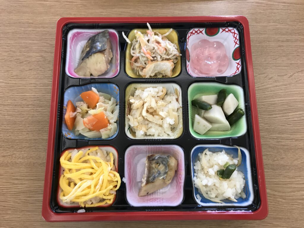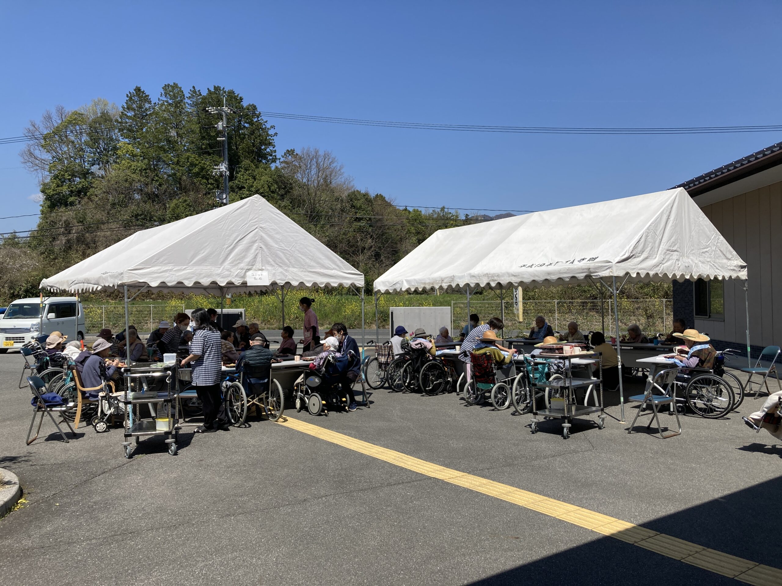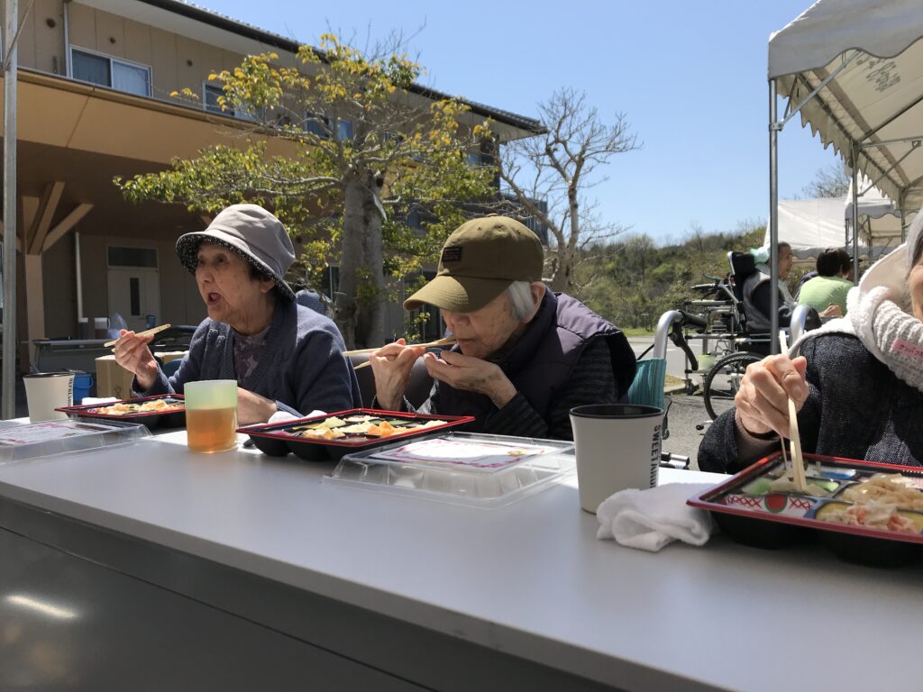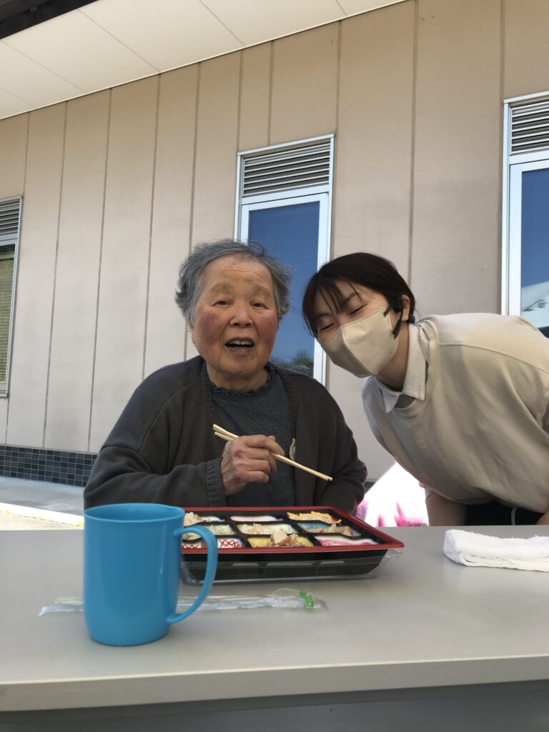 お花見会当日は、あいにく桜は散ってしまっていましたが、晴天に恵まれ、久しぶりの園外での食事となりました。「日が当たって気持ちのよい場所でのお弁当は最高じゃな」「お花見弁当がおいしかった」といった声も聞かれ、入居者の皆さまの笑顔があふれる、和やかなお花見会となりました。